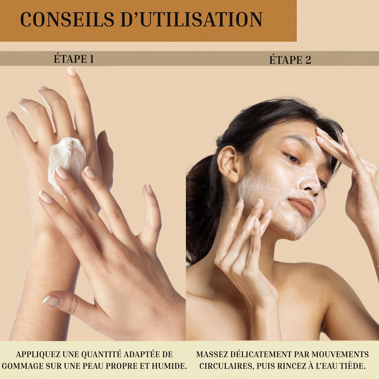 Déposez une noisette de gommage sur une peau humide, puis massez délicatement par mouvements circulaires pendant quelques instants. Insistez sur les zones plus rugueuses. Rincez à l’eau tiède. Utiliser 1 à 2 fois par semaine.